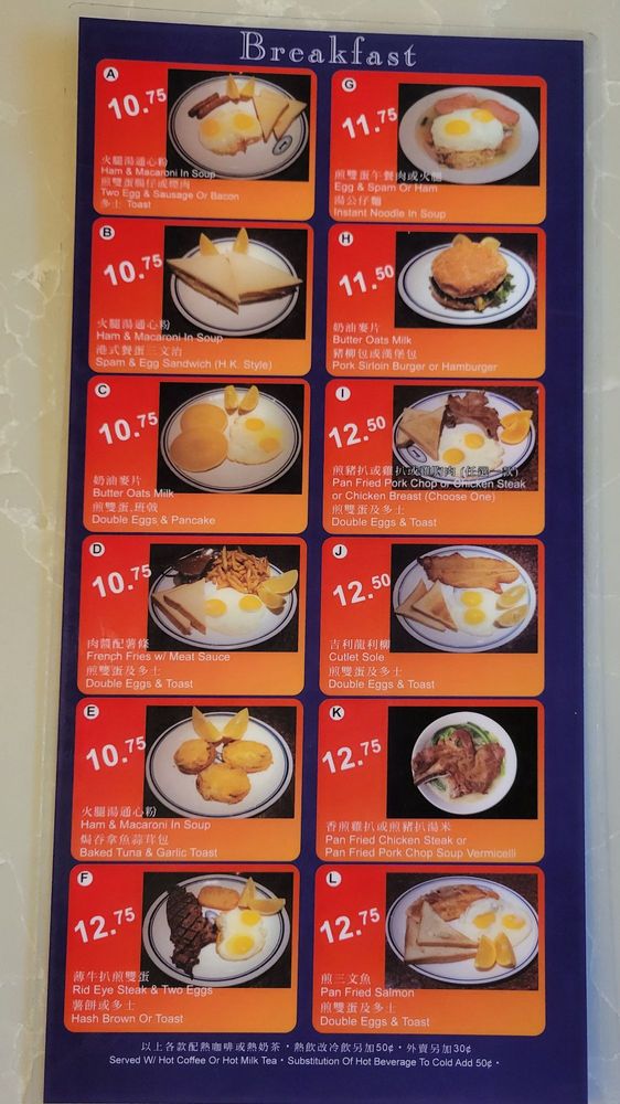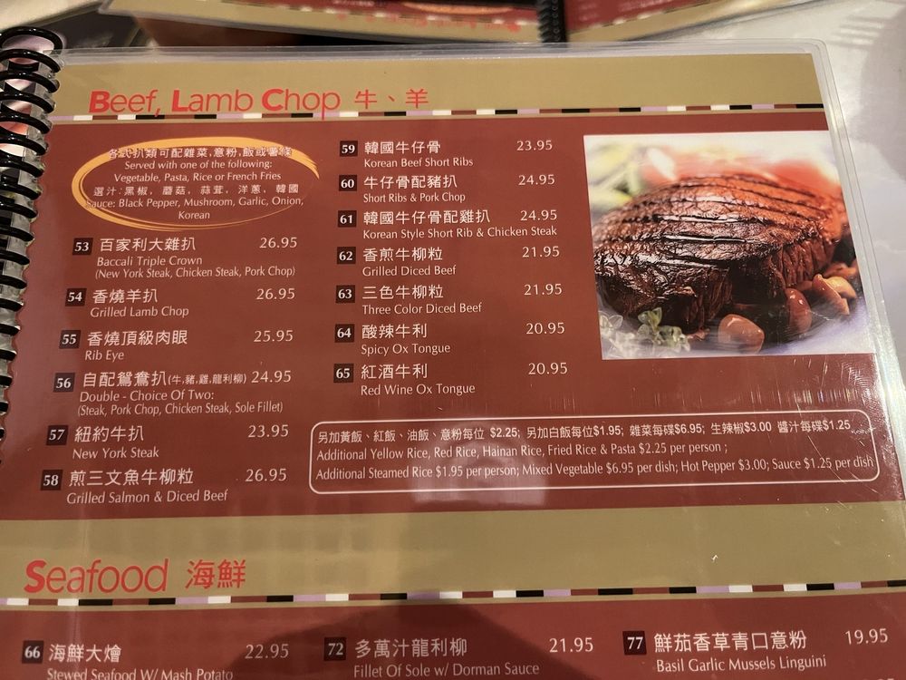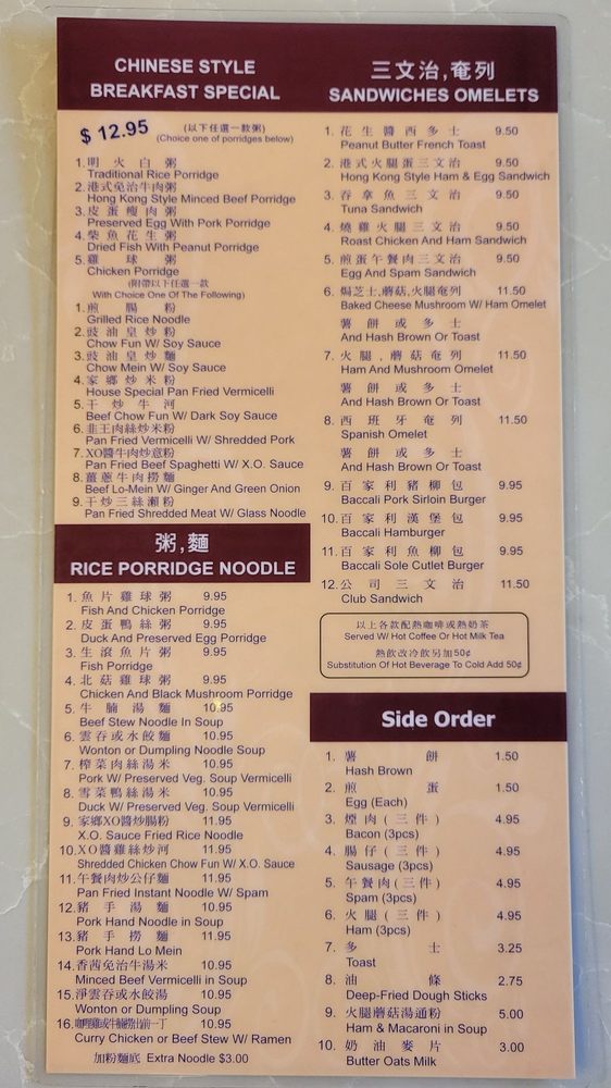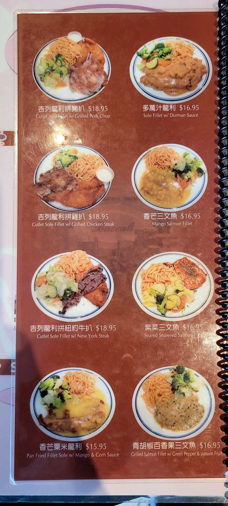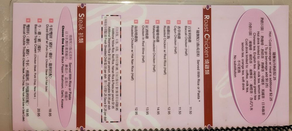 Baccali Cafe & Rotisserie in Alhambra, CA offers a diverse menu featuring Hong Kong Style Cafe, Asian Fusion, and Chinese cuisine. With options for pescatarians, vegans, and vegetarians, the establishment provides a welcoming atmosphere for all. Customers praise the generous portion sizes, flavorful dishes like the pepper sauce pork chop and cream soup with corn and ham. The whole chicken plate is a standout, with two small chickens perfect for sharing. Prices may be higher, but worth it for the quality and quantity of food. The bustling ambiance and attentive service make Baccali a top choice for families and groups. Don't miss the nostalgic ketchup spaghetti or the delicious yellow curry. Overall, Baccali Cafe & Rotisserie stands out as a gem among Chinese cafes in the 626 area.